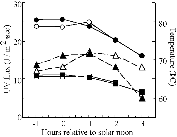 Fig. 4. Solar dosimetry performed on two typical days, 21 July, 1999 (open symbols) and 22 July, 1999 (solid symbols). Temperature (triangles), UV-A flux (circles) and UV-B flux (squares) were recorded.