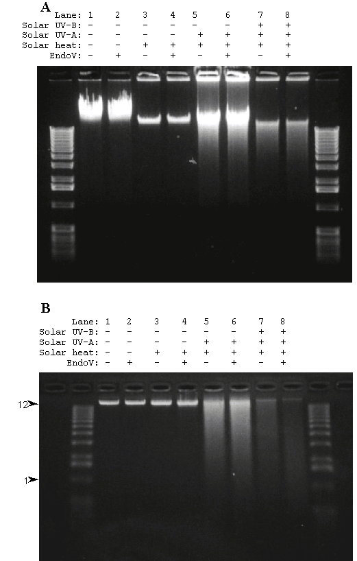 Fig. 4. Chromosomal DNA extracted from spores of strain WN356 exposed to UV-A sunlight on 5-16 October 1998 and full spectrum sunlight on 4-5 of August 1998 was electrophoresed through a neutral 0.8% agarose gel (A) or a 0.8% alkaline-agarose gel (B). Spores are: not exposed (lanes 1 and 2); exposed in parallel to heat only (lanes 3 and 4); exposed in parallel to UV-A sunlight only (1.1 x 10 6 J / m2, lanes 5 and 6); exposed to full spectrum sunlight (8.23 x 105 J/m2 UV-A + 3.53 x 105 J/m2 UV-B) (lanes 7 and 8). Isolated DNA was treated with Endo V before electrophoresis (lanes 2, 4, 6, and 8). M, molecular weight markers. The 12 kb and 1 kb markers are indicated with arrowheads..
