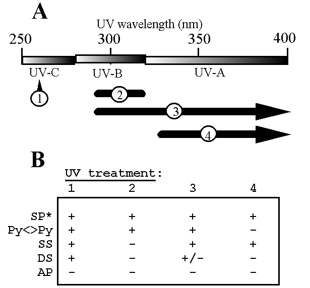 Fig.6. A. UV treatments to which spores have been exposed. 1, artificial UV-C (254 nm); 2, artificial UV-B (290-310 nm); 3, full-spectrum sunlight (>290 nm); 4, “UV-A” sunlight (>325 nm). B. Summary of B. subtilis spore photochemistry at different artificial and environmental UV wavelengths. UV treatments are numbered as in part (A). SP, spore photoproduct; Py<>Py, cyclobutyl pyrimidine dimers; SS, single-strand breaks; DS, double-strand breaks; AP, apurinic/apyrimidinic sites. +, damage detected; +/-, damage barely detectable; -, damage not detected. *SP data are from Tyrrell (1978).
