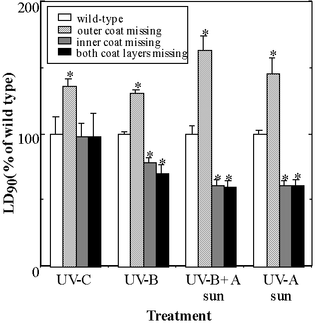 (i) Spore coats. Mutant B. subtilis spores lacking the inner, outer, or both spore coat layers were tested for their resistance to UV radiation both in the lab and in the environment (Riesenman and Nicholson, 2000). Spores lacking the inner coat and spores lacking both inner and outer coats were found to be more sensitive to UV-B in the laboratory and to solar radiation (Fig. 7).