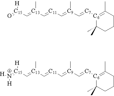 Structure of retinal (a, top) and its Schiff base (b, bottom) showing numbering of atoms.