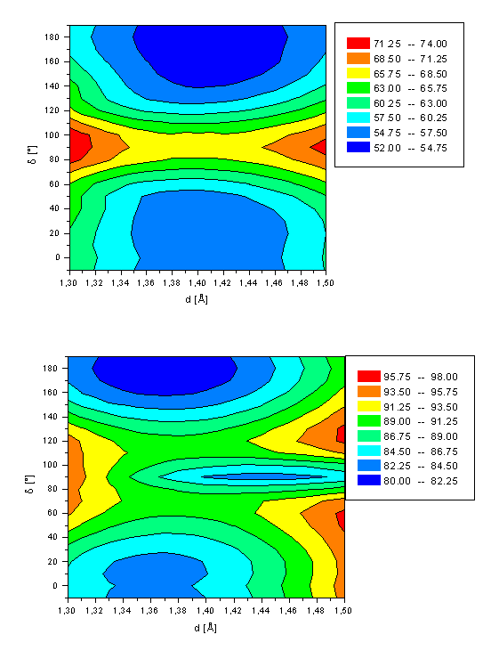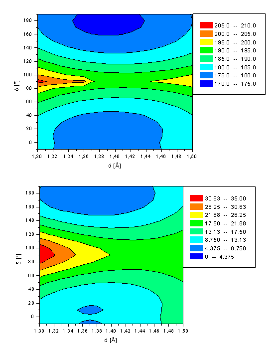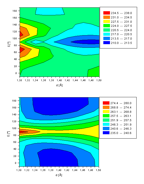 The two energy minima structures of the second excited state of retinal (d=10° and d=180°) are best described by a HOMOàLUMO transition (~80%). The conformation at d=90° is a third energy minimum for d(C11-C12)=1.44Å. The twisted molecule is of comparable energy (DH=83.4kcal/mol) as the local minimum at d=10° with DH=83.6kcal/mol. The energy barrier for the all-trans à 11-cis rotation is calculated to be 9.6kcal/mol (all-transà11-cis) and 6.4kcal/mol for the 11-cis à all-trans pathway, respectively. Both energies are significantly smaller than for the rotation in both the ground and first excited state. No energy minimum is observed for the bond length d fixed to its equilibrium length of 1.36Å. A two-dimensional cut of Figure 3a at d=1.36Å reveals a saddle point at d=90° with a rotation barrier of 6.9kcal/mol (DH(d=180°-d=90°)) and 3.7kcal/mol (DH(d=10°-d=90°)), respectively. This clearly demonstrates the necessity of including the bond length d into the computations.