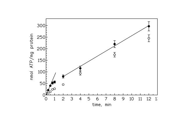 Figure 1. ATP synthesis in ROS disk membranes. The external free calcium concentration was about 1 mM ( l ). Thapsigargin (1.5 mM) or vanadate (10 mM) or Ca-ionophore A23187 ( O )were added to samples of disk membranes 20 min before the experiment was started. Each point represents the mean of triplicate measurements.