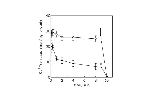 Figure 3. Activation of calcium release from disk membranes by ADP. Both curves refer to samples containing 1mM ADP, the curve made by unfilled circles refers to samples containing also 1.5 mM thapsigargin. The external free calcium concentration was about 1 mM. At the time indicated by the arrows, 5 mM calcium ionophore A23187 was added to the samples.