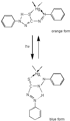 Metal dithizonate dyes are one of the earliest organic dyes that were found to exhibit photochromism. For first time Irving, et al.,[8] and Webb, et al.,[9] report independently that the mercury(II) complex is photochromic. Benzene or chloroform solutions of HgDz2 irradiated or placed in bright sunlight change the normal orange-yellow colour to an intense royal-blue colour. After stopping of the irradiation the orange-yellow colour return slowly. These colour changes can be repeated many times. After these articles the photochemistry of mercury-dithizone complex (HgDz2) and organomercury-dithizone complex (R-HgDz) have been extensively investigated [10-12]. The type of the transition is shown in Scheme 1.