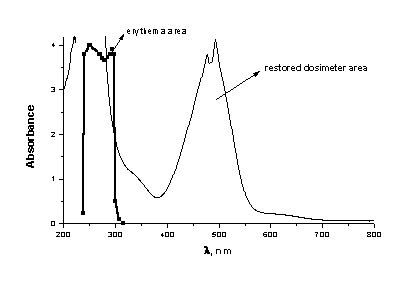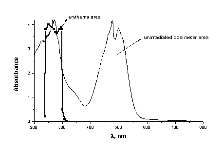 The linear dependence between the absorbance and the irradiation time respectively the UV energy show that there are not side reaction and the photochromic process is the only consumer of the UV energy. It is very important to be note that alternative triplet or sensitized reactions will be relative inhibited and inefficient in the polymer film. Another essential requirement in the design of PMMA/HgDz2 system as practical UV dosimeter is that the photoproduct of the photochromic process here has a strong and distinctive visible absorption, since its visual detection is critical to dosimeter function. Performance characteristics of such system with double function will be determined in the part by the efficiency of the phototransformation of the active compound – HgDz2 in the film and the effective cover of the erythema area for protection. On the other side the spectrum of the PMMA/HdDz2 film overlaps the activation spectrum for sunburning, obtained by multiplication of the erythermal response curve of Everatt et al.[16] by the same sunlight intensity data. Within limits, it is possible to modify the activation spectrum of the protector formulation by changing the concentration of the compound, the thickness of the polymer film and the change of the metal atom in the complex. These possibilities make the investigated system exceptionally mobile. In these directions the our investigations are in progress.