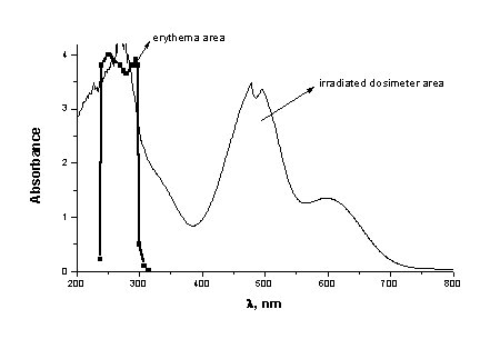 On the base of our initial spectral data it can well be seen that the UVB area is well covered from the UV absorption of PMMA/HgDz2 (Figures 1,2,3). The maximum sensitivity of this film lies between 270 and 315nm in the erythermal region, where most acute and chronic effects of sunlight exposure on biological systems are believed to occur. At the same time the area between 315 and 350nm is open, where the biological effectiveness of UV radiation is negligible at wavelengths above 315nm.