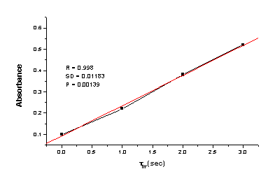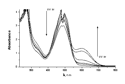 The unirradiated orange film shows an absorption band with maximum absorbance at 490nm. Absorption maximum at 600nm was not obtained (Figure 1.)