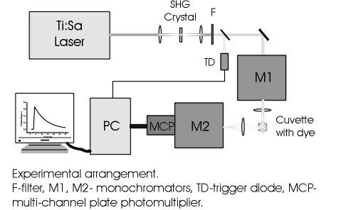 Materials and Methods Meso-tetra(4-sulfonato-phenyl)porphine (TPPS4) was obtained from Porphyrin Products (Lugan, UT, USA). Spectral grade solvents were used for all measurements, which were carried out at room temperature. Stock solutions of sensitizer (10-3 M) were prepared by dissolving crude TPPS4 in distilled water and adjusting pH to 7.5 with 0.1 M NaOH. Further dilution was carried out directly before the measurements. The pH of TPPS4 solutions was varied by adding small amounts of 0.1 M HCl. Steady state absorption spectra of TPPS4 were recorded by the Ocean Optics, PC 1000 fibre optic built-in spectrometer. Quartz cuvettes of 10 mm width were used. Steady state emission measurements were carried out on a Perkin Elmer spectrofluorometer LS50B. A picosecond pump and probe spectrometer based on Nd:YAG3+ laser and optical parametric oscillators was used to measure the time-resolved kinetics of absorption changes at the selected wavelength. The fundamental beam after single pulse selection was triplicated by glass plates placed beyond each amplifier. The most intensive pulse was used for pumping radiation. Two KDP crystals parametric laser excited by second harmonic of fundamental radiation produced continuously tuneable (800—1400 nm) probing light. The frequency doubling of output radiation gives the possibility of tuning the wavelength in the visible region up to 400 nm. Each of the less intense beams of fundamental radiation was used to form independent probing channels. One of them included heavy water cell to generate picosecond continuum as probing light. Another probing channel was based on temperature tunable LiNbO3 crystal parametric oscillator with frequency doubling. It was applied for accurate kinetic measurements at desirable wavelength within 400-2000 nm spectral range. As a result, a sensitivity of > 10-3 optical density units was obtained, the sample absorption being around one unit of optical density units. The time resolution of the spectrophotometer was up to 10 ps. Picosecond transient absorption and kinetics studies were performed basically as described previously [17]. Samples in a 1, 2, 3 and even 5 mm path length cells were excited with a 15 ps pulse at 532 nm (0.1 0.3 mJ) and probed at various delay times with a weak 25 ps broad-band (picosecond continuum in D2O) and/or parametric oscillator pulses at 590 nm. Fluorescence kinetic spectroscopy equipment is shown in Fig.2 A Kerr-lens mode-locked titanium:sapphire laser with a central wavelength of 800 nm, an average power of ~200mW and a pulse duration of about 140 fs was used as excitation source. The second harmonic of the 800 nm wavelength was generated in a BBO crystal of type I (oo-e). The experimental setup consists of two monochromators, one of which is used for tuning of the excitation wavelength and the other for tuning of the emission wavelength. The slits were set to 0.5 mm for both monochromators, this accords to a spectral width of ~2nm. A Hamamatsu micro-channel plate photomultiplier with an instrument response of 35 ps at FWHM was employed for counting of fluorescence photons. A time-correlated single photon counting unit and software (Becker & Hickl, SPC-430) were used for acquisition of fluorescence kinetics. The data were analysed using a fluorescence decay data analysis software (FluoFit from Picoquant GmbH), which allows deconvolution of measured data with the instrument response function. The time resolution that we attained with this system was ca. 20 ps. The excitation intensity was kept low so that the probability of detecting of one fluorescence photon per excitation pulse was between 0,01 – 0,1. Fig.2. Fluorescence kinetic spectroscopy equipment.