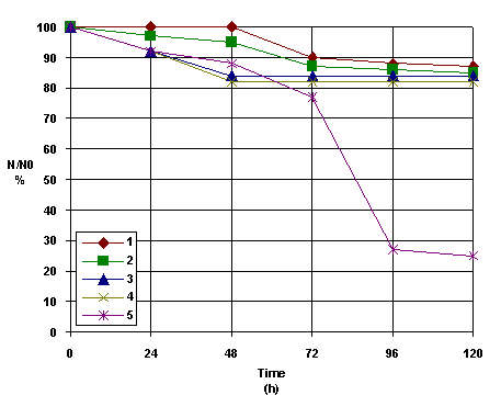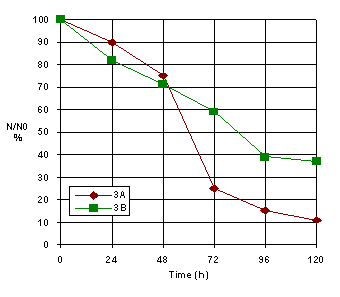 Rate studies of photodynamic inactivation of viruses as a function of time at constant light intensity show like in figure 2, expressed by the survival ration (N/N0) plotted against time.
