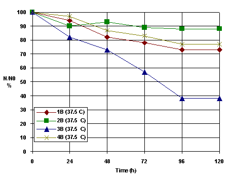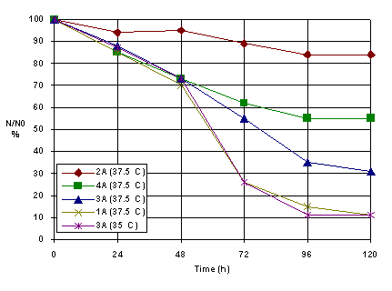 Figure 4. The inactivation kinetics for different HSV-derma cells (B-type suspension)