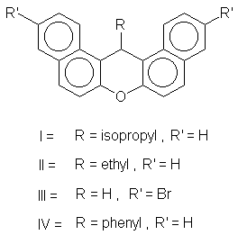 As expected [12] the substituted group (para substitution to the 14- position of dibenzoxanthene group) induces a slight red shift of the absorption band indipendent of the electron-donating properties of the substituent. The substituent effect is more selective when it involves the 14a- ( or 13b-) position of the pyranoyl ring of dibenzoxanthene along the polarization axis. Substitution to 14a- or 13b- on phenyl group along the polarization axis by electron-donating inductive effects (Br) as in (III) induces a blue shift of the absorption band while substitution with electron-donating groups in the position 14- (alkyl) slight shifts the absorption to the red; the effects are not additives, as demonstrated by compound III which bears both types of substituents. More interesting is the increase in rigidity of the phenyl substituents on blocking their rotation by incorporation them in a six-membered ring , resulting in a strong red shift of the 333 nm band by 13 nm ( compare sample I with III). But blocking the phenyl group at the 14-position of the pyranoyl ring does not produce any important effect since it is not oriented along the polarization axis.