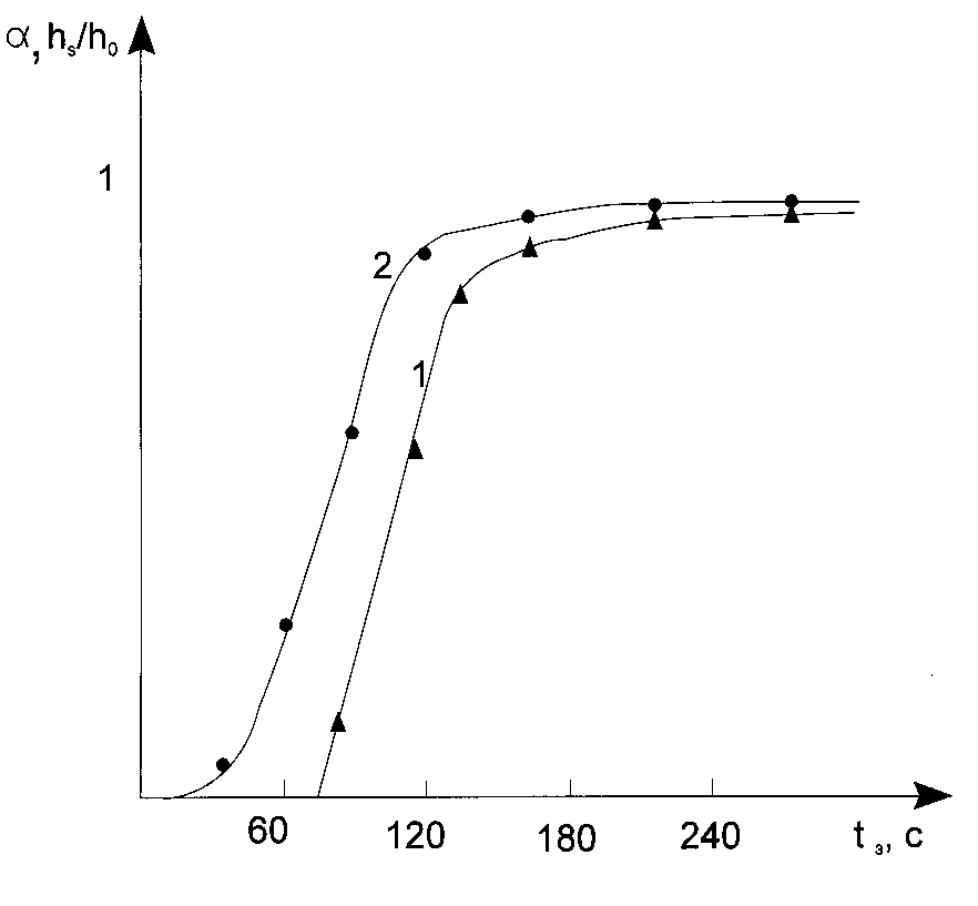 The said can be applied also to the methods based upon double bonds determination [10], gel fraction determination [14] and heat evolution determination. All these methods so as the different variants of delatometry give us a possibility to register characteristic curve, a (t), but not sensitometric curve, hS(t). From this point of view the methods based on refractive coefficient measurement in the photoresist layer is differs from others. The state of the art is that due to the constructive peculiarities of the grate amount of refractometers the principle importance for measurement is the difference in refractive indexes only at the interface between the two media testing material, placed on measurement plane of reflectometer prism, and material on the prism itself. The latter caused the fact that when one uses such an installation to register kinetical curve the paramount importance has only those processes taking place in a photoresist layer that occurring in just neighborhood from a substrate (a refractive prism surface). In other words, in this case the kinetic curve does correspond not to a (t), but a (h0,t) the dependence reflecting variation of monomer conversion in the layer at distance, h0, from the irradiated surface. For practical goals this gives more outlined than in the case of the said former methods the seeming dependence of both inductive period and polymerization rate upon the photoresist layer thickness (See Fig.2). The latter is a consequence of the light intensity lowering due to absorption of the photoresist layer.