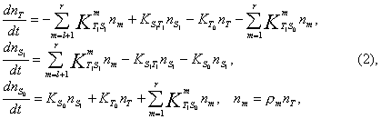 where nT = n0, nS1 = nS0 = 0 are the total populations in the states T1, S1 and S0 at t=0, nm is the population of the vibration level m, rm is the population distribution function satisfying the condition
