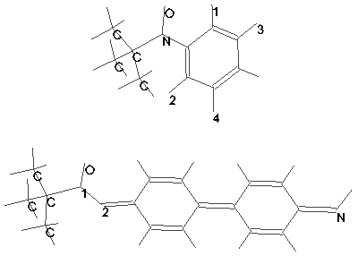 The quantum chemical calculations of the Fermi contact spin densities ( Table 1 ) gave us an opportunity to eliminate from our consideration the second structure because of spin density on the nitrogen atom directly connected with nitroxyl nitrogen is not zero ( See line 2 for structure 2 in Table 1).
