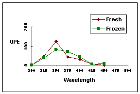 *10 ml DMEM Although there was a small increase in the induced photon emission from fresh cells, most probably due to the stress condition of the transport, it can be concluded that the frozen cells showed the same type of emission. Similiar results were obtained for monochromatic induction of the fibroblasts in the range of 300-450nm as shown for MMC- mitotic cells in Figure 1. Figure 1. Monochromatic light (300-450 nm) induced ultraweak photon emission (UPE; cps/100) in immediately trypsinzed monolayer fibroblasts (fresh) compared to fibroblasts transported in liquid nitrogen (frozen)