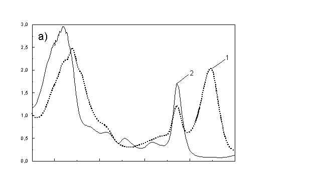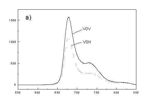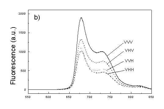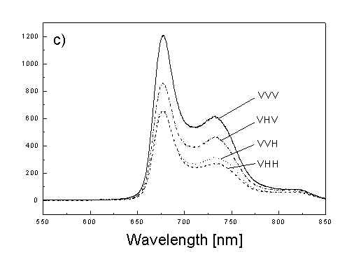 Figures 2a, 2b, 2c show the set of polarized fluorescence spectra for a sample with low content of the oligomers. It is interesting that in stretched samples with whole bacteria and bacteria fragments the ratio of emission belonging to small aggregates (at 730 nm) to that of monomeric (at 670 nm) is higher than in unstretched films. It follows from absorption that stretching causes decrease in oligomerization. The desaggregation can undergoes on small aggregates rather than on monomers. It is also possible that TMs of small aggregates are located in stretched samples closer to film plane than in unstretched film and therefore they give larger contribution to emission spectra. In unstretched samples the degree of anisotropy of emission due to photoselection is lower than in stretched samples because (V0V-V0H)/(V0V+2V0H) < (VVV-VVH)/(VVV+2VVH). It is very characteristic that in both stretched samples components VVH are very similar to VHH and low. It means that chromophores emitting fluorescence polarized perpendicularly to polarized excitation are in low extent oriented and not very numerous. Emission of oligomers in cells embedded in PVA film is always low [4,5] therefore polarized emission of such samples are not very well reproducible (not shown). fig. 2. Polarized fluorescence spectra: (a) whole cells without oligomers in unstretched film; (b) the same sample in stretched film; (c) cell fragments in stretched film (notation of polarized components - in text).