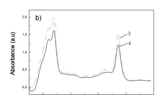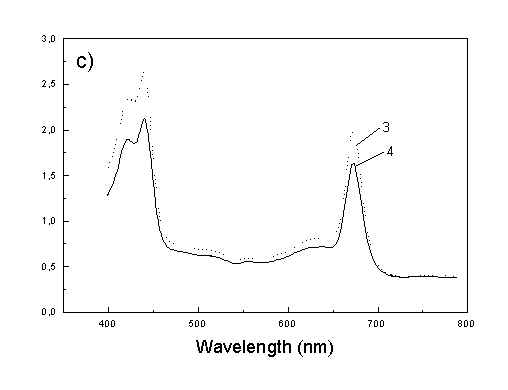 Results Figure 1a shows the absorption spectra of two types of whole bacteria cells in isotropic film. As it follows from the ratio of absorption in 750 nm (oligomeric absorption) to absorption at 670 nm (monomeric BChl c, bacteriopheophythin c and eventually small aggregates of BChl c [6]) the degree of oligomerization in these two samples are different. As it was shown previously [4,5] the BChl c after desaggregation is in some extent oriented. The same conclusion follows from Fig. 1b showing the polarized absorption of whole bacteria with desaggregated oligomers located in stretched film. The cell fragmentation usually caused desaggregation of BChl c [4,5], but also in this case the pigment is in some degree ordered in stretched film (Fig. 1c). Fig. 1. Absorption spectra: (a) whole cells: curve 1 - sample with oligomers; curve 2 - with desaggregated oligomers; (b) polarized absorption spectra of whole cells without oligomers and (c) polarized absorption of cell fragments in stretched film, curve 3 – parallel and curve 4 – perpendicular polarized components.