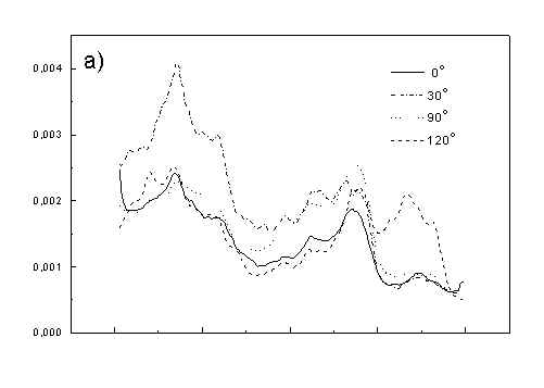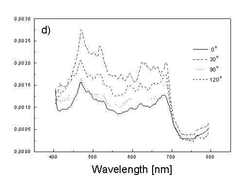 Figure 3 show the polarized PAS spectra of two types of whole cells samples in unstretched film (Fig. 3a with oligomers and Fig. 3b desaggregated whole cells). Figure 3c presents whole cells without oligomers sample in stretched film, Fig. 3d the cell fragments also in stretched film. Not all measured spectra are shown in these figures because the presentation of all spectra for six different polarizations makes figures to crowded. It is possible to see the orientations of TMs in oligomers and in desaggregated BChl c. Also orientation of carotenoids is different from that of BChl c. The thermal deactivation in a region of Soret band is low, lower than in a region of carotenoids absorption. Similar effect was observed for cyanobacteria [7]. Carotenoids, when are not engaged in excitation energy transfer to other pigment have always efficient thermal deactivation because their yield of fluorescence is low. Fig. 3. Polarized photoacoustic spectra (a,b - in unstretched film, c,d - in stretched film): (a) whole cells with oligomers; (b) whole cells without oligomers; (c) whole cells without oligomers; (d) cell fragments. Angles between electric vector of light and axis in film plane are given in Figs.