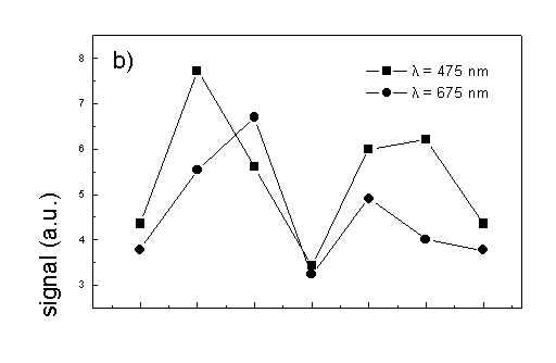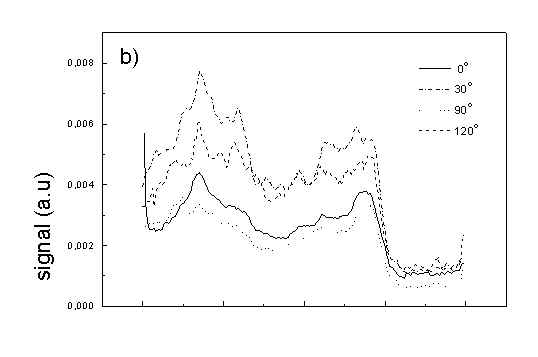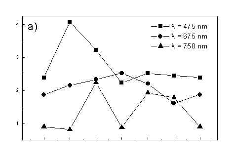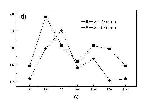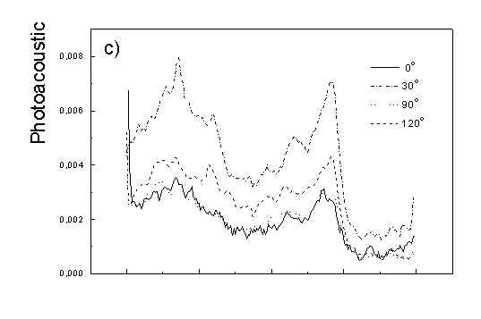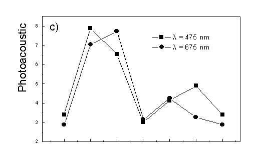 Figure 4 shows the dependence of PAS amplitude on the angle q between film axis and the direction of electric vector of light. In a case of unstretched film direction in a film plane is arbitrary, but direction of electric vector of light is changed on 30 deg from 0 deg till 180 deg, similarly as in a case of stretched samples. As it follows from Fig. 4a (whole cells with oligomers) and Fig. 4b (whole cells with desaggregated oligomers) main maximum of carotenoids in both cases occurs at 30 deg. In a sample without oligomers a second smaller maximum of carotenoids is observed in 120-150 deg region. This maximum is absent in a sample with oligomers. The curves for a region of monomer and small aggregates (675 nm) is quite different for two samples. In a sample with oligomer it has only one maximum at 90 deg, whereas a desoligomerized sample exhibit at 90 deg deep minimum, and two maxima at 60 deg and 120 deg. It shows that oligomers can be desaggregated as it was previously supposed [4,5] on small aggregates exhibiting quite different orientation than monomeric pigment. Only in instretched film with whole bacteria (Fig. 4a) the maximum for 750 nm at 120 deg is seen. The stretching perturbs the orientation and aggregates, as it follows from Fig. 1b, therefore the oligomer maximum is not seen. And as it follows from the comparison of Fig. 4a and Fig. 4b perturbing previous orientation of monomeric pigment located also in chlorosomes. In a sample with oligomers the angle between orientation of carotenoids and monomers of BChl c is about 60 deg, whereas in sample without oligomers this angle is about 30 deg. Similar angle is observed in whole cells in stretched film (Fig. 4c) and in cell fragments stretched film (Fig. 4d). Both samples in stretched film are without oligomers. From Fig. 4 we can draw information about average angles of orientation of the pools of chromophores responsible for efficient thermal deactivation of energy. Comparing Fig. 3a (PAS spectra) with Fig. 1a (absorption) we can see that the efficiency of thermal deactivation is much lower for oligomer than for small aggregates and monomers region. It is reasonable because desaggregated pigment is excluded from the chain of excitation energy donors and acceptor. From oligomers the excitation energy transfer to the direction of reaction center is competing successfully with thermal deactivation and emission of fluorescence. It is not possible to compare the observed angles with the known [1,2] structure of chlorosome, because results concern only the groups of chromophores efficiently converting the excitation energy into heat. Fig. 4. The amplitudes of photoacoustic signal as a function of angle between film axis and electric vector of light (q ) for some wavelengths of light (given in figure: 475 nm - absorption of carotenoids; 675 nm - monomers and small aggregates of BChl c; 750 nm - oligomers of BChl c); (a) – (d) have the same description as in Fig. 3.