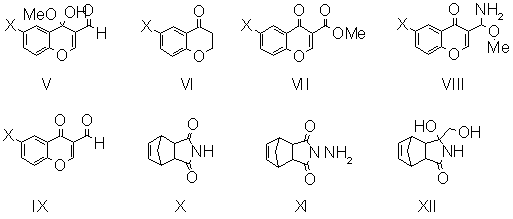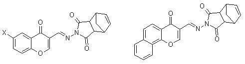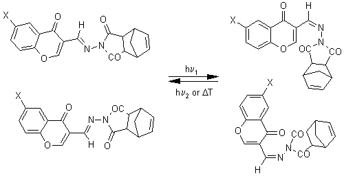 1. Introduction Compounds possessing the exocyclic C=N bond as well as the C=C and N=N bonds respectively undergo the isomerization. The conversion from one isomer to the other can be initialized by light or by temperature [1]. In the case that the E-Z isomerization is reversible photochemical process and both isomers have different absorption spectra, this phenomenon is called photochromism [2]. Besides E-Z isomerization about the C=N double bond, the possibility of conformer and tautomer formation should be considered in dependence on the structure of fragments. Structure of the fragment adjacent to C=N double bond can effect photochemical or thermal reactivity of compounds with photochromic properties. In this paper we describe the photochemical system where photochromism depends on the geometric isomerization of substituted 6-X-4H-3-bicyclo[2.2.1]-5-heptene-2,3-dicarboimido-iminomethyl)-4-chromones (Fig. 1.). The photochemical reactivity of these compounds and thermochromism were studied. (I) X = Cl; (IV) (II) X = CH3; (III) X = NO2; Fig. 1. Structure of studied compounds.