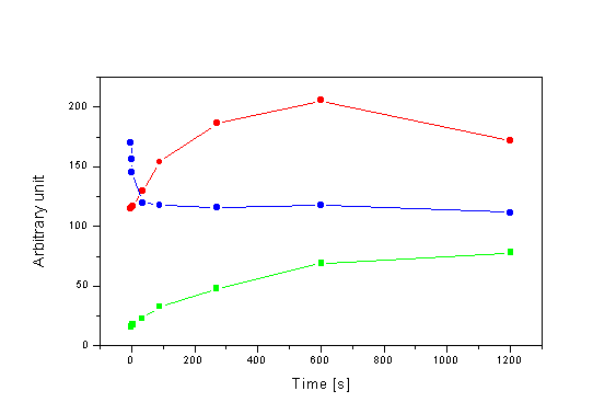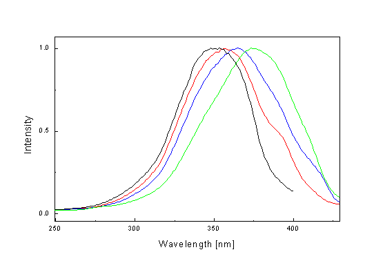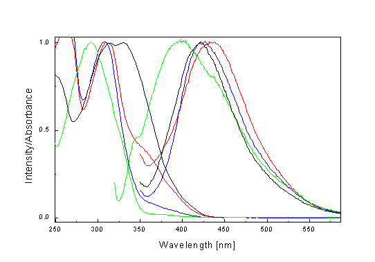 * shoulder Substitution of phthalimide for NH-Ph fragment in the molecule has much more influence on absorption spectra (l max = 355 nm in CH3OH). This change of absorption spectra can be caused by the different electron-donor ability of both fragments. The fluorescence emission of the studied compounds has a very low intensity in the range of l = 350-550 nm (Fig. 2). Maximum of the fluorescence emission is red shifted with electron-donor ability of the substituent. Intensity of fluorescence emission in benzene is lower compare to methanol and increases with decreasing temperature. Maximum is blue shifted (~ 4 nm). We were interested also to find out which part of the structure I-IV is important for the observed fluorescence. Spectra of parent chromone aldehydes were measured therefore. The fluorescence of the corresponding chromone aldehydes compare to the fluorescence of I, II, III and IV has nearly the same position and shape (Fig. 3.) but they are different only in the intensity of fluorescence. For example, the intensity of the fluorescence of 6-methylchromone-3-carboxaldehyde is 20 times higher than intensity of the fluorescence of II. From the mentioned above follows that the fluorescence occurs from the singlet state which is localised on the chromone fragment of II The fluorescence spectrum of N-aminobicyclo[2.2.1]-5-heptenedicar-boximide) is blue shifted ~ 60 nm compare to II or 6-methylchromone-3-carboxalde-hyde, respectively (Fig. 3.). Fig. 2. Fluorescence emission and absorption spectra of the E-isomers of I (red), II (blue), III (black) and IV (green) in methanol (l ex = 310 nm) Fig. 3. Fluorescence emission spectra (l ex = 310 nm) of II ( blue) correspond 6-methylchromone-3-carboxaldehyde (red) and N-aminobicyclo[2.2.1]-5-heptenedicarboximide (black). Excitation spectra of the chromones depend on the wavelength of the emission (Fig. 4.). Changes in excitation spectra are caused by the photolability of the E-isomer Fig. 4. Fluorescence excitation spectrum of the E-isomer of I in methanol [l em = 420 nm (black), 450 nm (red), 480 nm (blue), 540 nm (green)]. as well as the presence of their conformers in the solution which can be