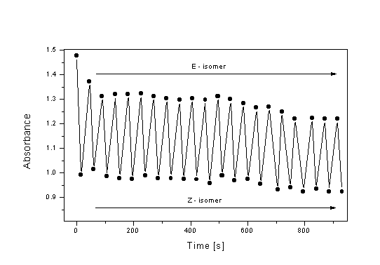 explained by steric hindrance of the substituent. The major contribution has internal rotation entropy, which characterize intramolecular rotation about the bonds in molecule. The solvatation ability and polarity of the solvent play important role in the thermal isomerization. In contradiction to isomerization in CH3OH, thermal isome-rization was not observed in the range 19-58 oC. The long-wavelength absorption in UV spectra in benzene is blue shifted by ~ 4 nm (l max = 310 nm). From the small shift in absorption spectra follows that the change of energy is small and can hardly block thermal isomerization. A rapid isomerization was detected in CH3OH but a very slow one in hexane. Optimalization of the geometry of E and Z isomers by Hyperchem 3 confirm the assumption that these isomers are not planar. E and Z isomers have chromone fragment and C=N bond in one plane and phthalimide fragment is out of this plane. The lone pair of nitrogen of the Z-isomer can interact with p-electrones of phthalimide carbonyl group [4]. Substituent effects the electrone density of the lone pair of the nitrogen atom as well as the strength of interaction. The strength of this interaction has influence on the thermal stability of the Z isomer. Light of the halogen lamp which is absorbed by the Z-isomer has enough energy to initialize Z-E isome-rization in benzene. The change of absorption of the E-isomer occurs very fast upon UV irradiation. After ~ 15 s irradiation, the equilibrium of the E and Z isomers is reached in both solvent. Applaing the light of the halogen lamp on the reaction mixture, Z-E isomerization occurs and the absorption returns to the initial state. This process was repeated many times (Fig. 6.). Prolongation of irradiation (l = 310 nm, t = 50 min.) Fig. 6. Change of UV absorbance (l = 308 nm) of II after alternate irradiation by UV light (310 nm, D = 15 s) and VIS light (halogen lamp, D = 30 s).