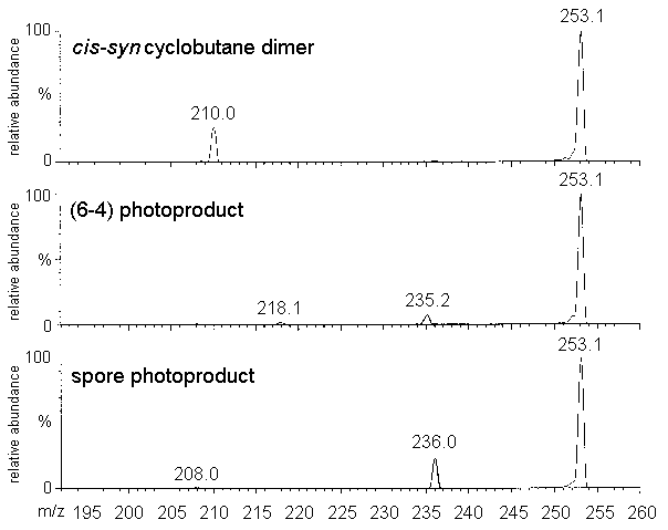 the related Dewar valence isomer and the spore photoproduct. Fragmentation mass spectra of
