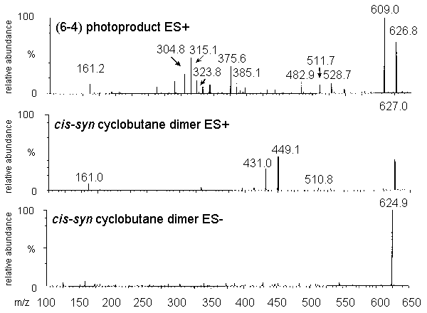 negative mode. In contrast, the pseudo-molecular ion of the (6-4) photoproduct and of its
