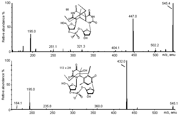 fragmentation spectrum of the TpT cyclobutane dimers was observed at m/z=447 in the