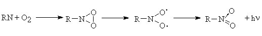 On the basis of the obtained results it is possible to make some preliminary conclusions. Some products of the DA photooxidation (at least two) may be formed in the excited states so they can emit chemiluminescence. Formation of both emitting intermediates is strongly depending on irradiation time. As the second pick was observed at the irradiation time about 1 min it was possible to propose that the second excited product was formed as a result of absorption followed by photochemical reaction of one of the intermediates of the DA photooxidation which life-time was in the interval 30 < t < 75 s. DISCUSSION The azide photooxidation reaction was the subject of some works [4-6]. The first step of the process is the azide group photolysis to produce nitrene and eliminate molecular nitrogen. The chemiluminescence observed may be emitted by the particles in the excited state. They can be formed as a result of (i) Triplet-triplet annihilation of the triplet nitrene and molecular oxygen [5]; (ii) Destruction of the tetraoxide [5,6]: (iii) A reaction of the type