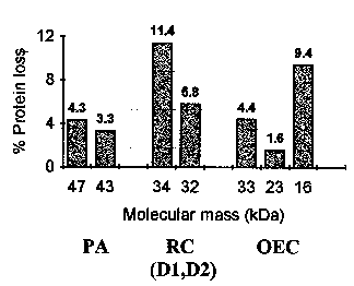 about 11.4 % (D2 protein of the PSII-RC), and can be as low as 1.6 %. Figure 2. Protein loss in photosystem II (PSII) irradiated 90 minutes with UV light of 280 nm wavelength and low intensity (2.0 W/m2). PSII protein complexes affected by the UV radiation: D1,D2, D1 and D2 proteins in the PSII reaction center (RC); OEC, oxygen-evolving complex; PA, proximal antenna; RC, reaction center.The interesting point in the afore discussed experiments is that 90 min is an irradiation time about six times larger than the irradiation time required to induce a 50 % loss of oxygen-evolving activity in PSII, i.e., 15 min (cf. Fig. 1). If the data in Fig. 2 are extrapolated to a 15 min period of irradiation with UV280 light, one gets protein losses of less than 2 % for the D2 protein of PSII-RC and as low as 0.3 % for the extrinsic protein of 23 kDa. A straightforward conclusion is to interpret the large decrease of