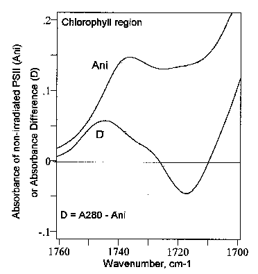 3 % (677 nm) and ~ 2 % (624 nm). Figure 5. Difference spectrum of photosystem II (PSII) in the chlorophylls region from 1800 to1700 cm-1. Ani, absorbance spectrum of non-irradiated PSII. D, difference FT-IR spectrum of PSII, i.e., [PSII irradiated with UV280]-minus-[PSII non-irradiated]. A280, PSII irradiated 30 min with 280 nm light. On the whole, the afore discussed data are a clear indication that