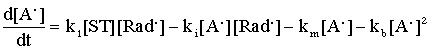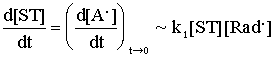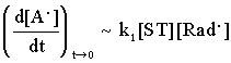 For chain reactions with quadratic combination of the radicals the rate of accumulation of native free radicals : d[Rad.] / dt = Wi - k1[ST][Rad.] - ki [A.][ Rad.] - kt [Rad.]2 = 0 (5) where Wi refers to initiation. By assuming that at very low conversions the rate of the induced decomposition of the adduct is negligible equations (4) and (5) give: