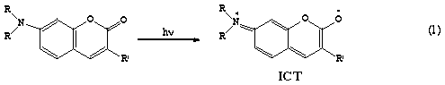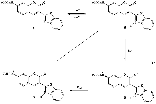 Azole-Linked Coumarin Dyes as Fluoresence Probes of Domain-Forming Polymers Guilford Jones, II,* and Jennifer Ann C. Jimenez Department of Chemistry and the Photonics Center, Boston University, Boston, MA 02215 ABSTRACT The binding of 7-aminocoumarins, substituted in the 3-position with heterocyclic benzimidazole or benzothiazole groups by domain-forming polymers in water has been studied. The acrylic polyelectrolyte, poly(methacrylic) acid (PMAA) was used as a solubilizing agent for coumarin dyes 6, 7, and 30 in water. The acid-base properties of these bound coumarin dyes were monitored spectroscopically on titration of aqueous solutions. Alterations in the fluorescence wavelength and intensity, quantum yields, lifetimes, and polarization are consistent with the preferential binding of the dyes in compact hydrophobic domains that form at a pH regime in which the polymer is in its protonated (uncharged) state. In this pH range (< 4.0), coumarins 7 and 30 are bound as monocations, whereas coumarin 6 remains in its neutral form. Reduced quantum yields and lifetimes of fluorescence for cationic coumarins can be understood in terms of the imposition of a low-lying electron transfer state, an example of a twisted intramolecular charge transfer (TICT) intermediate. Effects of polymer microenvironment on the rate of TICT state decay (a reverse electron transfer) are observed. Coumarins of the azole type may find use as fluoroprobes of the microenvironments of proteins and other biological macromolecules and as agents for pH sensing. 1. Introduction A number of papers from our laboratory have focused on the fundamental photochemical and photophysical properties of coumarin laser dyes [1]-[7]. Of special interest has been the use of polymeric media in which dyes may be doped (solid acrylics) [8]-[11] or bound in microdomains in water [6], [7], [10]. Receiving the most attention in the latter application is the polyelectrolyte, poly(methacrylic) acid (PMAA), which has been shown to increase the solubility and to amplify fluorescence yields of coumarin dyes in water [7]. The ability of this polymer to recognize and complex hydrophobic agents when it assumes a compact hypercoiled conformation is well established [12]-[15]. Studies of PMAA complexation of dyes have also been extended to other structures such as the triarylmethanes [16], the rhodamines [17] and the cyanines [18]. Within the class of 7-amino coumarins that typically display favorable fluorescence and lasing properties, the derivatives that bear an additional heterocyclic (azole) substituent at the 3-position have several differentiating properties. They display smaller Stokes shifts of fluorescence, indicative of a lower degree of charge transfer for low-lying excited species [1],[5]. Moreover, they potentially have an additional state of protonation, since the benzimidazole group (for example) is known to have a pKa of 5.48 [19]. The acid-base properties of coumarin 6 have in fact been examined recently, particularly from the point of view of using the dye as a probe of acidic sites in zeolites or clays [20]. Electronic spectral data and NMR results are consistent with protonation of C6 at the benzothiazole ring nitrogen (Scheme 1) with concomitant shifts of absorption and emission bands [20]. In the present study, we have investigated coumarins 7 (1), 30 (2), and 6 (3) (Scheme 2), in order to determine both the acid-base properties and the potential for intramolecular electron transfer for this important series of dyes. Fluorescence properties, including quantum yield, lifetime, and polarization have been recorded as a function of pH for mixed organic/water media. For water samples in which dyes are solubilized using PMAA, 1 and 2 are shown to form polymer complexes in their protonated forms for moderately acidic pHs, whereas 3 remains neutral when bound to the hypercoiled polymer. A pathway involving charge transfer excitation, followed by non-radiative return to the ground state via electron transfer has been identified for 1 and 2. The 7-aminocoumarins studied here can be used as fluoroprobes for microenvironments of systems such as thin films, polymers and proteins that are of commercial or biological importance [21],[22]. These dyes should serve as sensitive probes of micropolarity and pH for biopolymers and biomembranes, or other self assembled systems [22]-[25]. 2. Experimental Section Materials. The coumarin dyes used in this study were used as received from Eastman Kodak and Acros Organics. They were determined to be relatively pure by thin layer chromatography, NMR and melting point determination. Trifluoroacetic acid was obtained from Aldrich. Poly(methacrylic acid), PMAA was prepared following a reported procedure [14] using twice distilled methacrylic acid dissolved in N,N-dimethylformamide (DMF); polymerization proceeded under Ar at 55-65o (20 hr), using the initiator, 2,2'-azobis-isobutyronitrile (AIBN). Fractionation of the polymer [26] provided a sample that was determined to have a number averaged molecular weight of 25,000 g/mol by viscometry (Ostwald viscometer) [27]. Water used for preparation of aqueous solutions of the samples was generated from Millipore Milli-Q Water system (resistivity, 18 MW/cm2). Instrumentation and Methodology. Absorption spectra were recorded on DU-7 and DU-640B Beckman spectrophotometers. Steady state emission, fluorescence polarization, quantum yield and lifetime measurements were measured on SLM Aminco 48000 and Felix/Timemaster (Photon Technology International, Inc.) fluorometers. The PTI LaserStrobe fluorescence lifetime and steady state fluorimetry system is described in a forthcoming paper [28]. Aqueous solutions were prepared by combining stock solutions of the coumarins (2 mM in DMF) and solutions of the polyelectrolytes (50 mM) appropriate for producing proper ratios, R/D, the ratio of molar concentrations of polymer (monomer residues) and dye. The solutions were sonicated (typ