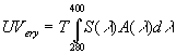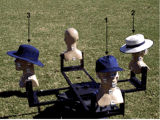 where A(l ) is the erythemal action spectrum (CIE, 1987), S(l ) is the spectral irradiance and T is the exposure period. 2.2 Erythemal Exposures A rotating base with four upright human headforms was used to model random movements of a human in an upright position. Each head form, as shown in Figure 1, was located approximately 1 meter from other neighbouring headforms and this distance was selected to minimise the effect of reflections from the other headforms. Airey et al (1995) and Holman et al (1983) have compared human UV exposures to that of head forms and body forms and found that UV exposures to manikins can be related to human UV exposure. The headforms were rotated on a portable rotating base at a speed of approximately 1 revolution per minute in an open unshaded area, 50m from the nearest trees and buildings. The area was covered in grass with an albedo of approximately 3% at 60 cm from ground level as measured with a hand held erythemal UV meter. The albedo was calculated as the ratio of the upward and downward erythemal UV irradiance levels as measured with an erythemal UV meter (Model 3D V2.0, Solar Light Co., Philadelphia, PA). In this paper, only the upright position of the headform is employed and no other head tilt positions are considered. Polysulphone dosimeters were placed at 16 sites on the headform, namely: vertex of the head, forehead, nose, chin, left cheek, left ear, right cheek, right ear, upper front neck, lower front neck, left neck, right neck, left shoulder, right shoulder, rear upper neck and rear lower neck. Sixteen dosimeters were selected so as to obtain a more accurate assessment of the UV distribution over the human face as the human face has a complicated topography and the high number of dosimeters used provides a better picture of the UV distribution of the human facial UV exposure. These experiments were conducted at a sub-tropical southern hemisphere latitude in Toowoomba (27.5 oS, 151.9 oE), Queensland, Australia. The erythemal exposures were measured in autumn between 22nd April, 1999 to 28th May 1999 from 09:00 Australian Eastern Standard Time (EST) to 12:00 EST and in one hour intervals from 09:00 EST to 12:00 EST. To assess the effect of cloud cover, experiment periods were divided into two distinct cloud groups: firstly, no cloud or total clear sky conditions and secondly total cloud cover as determined visually by an observer with the solar disk obscured. The experiments with total cloud cover had the solar disk completely covered with cloud of the strato-cumulus cloud type. The average solar zenith angle for the measurement period was 46.6° and 21.5° for 09:00 EST and 12:00 EST respectively. The three types of hats used in this study were a peaked cap, a broad brimmed woven hat and a broad brimmed "soft" hat. These will be referred to as hats 1, 2 and 3 respectively (Figure 1). These hats were selected for this study as they are worn by local schoolchildren. Figure 1 shows the shape and style of each of the hats. Hat 1 has a brim size of 7 cm, hat 2 has a brim size of 8 cm while hat 3 has a brim size of 7.5 cm and all are mounted at an angle between 12° and 18° to the forehead. The differing brim angles are due to the construction of the hats, where the brims are fixed to the crown of the hat at an angle. The rotating platform as shown in Figure 1 was designed so that 3 headforms with hats and 1 headform without a hat to act as a control could be exposed to solar UV simultaneously. 2.3 Ultraviolet Protection Factor The ultraviolet protection factor (UPF) was calculated for each facial site as follows (Gies et al., 1992): UPF = (UV Exposure without a hat)/(UV exposure with a hat) (2)