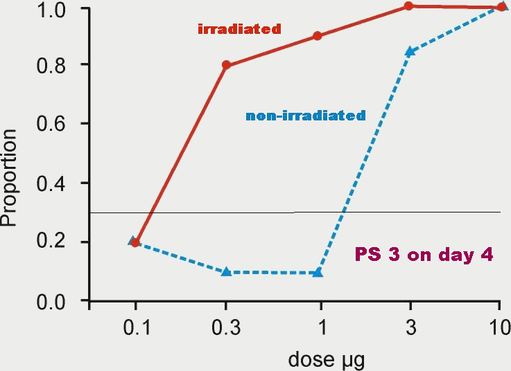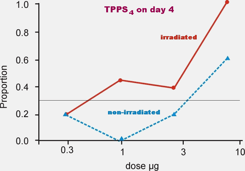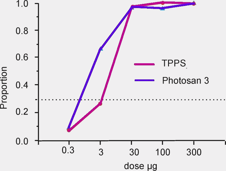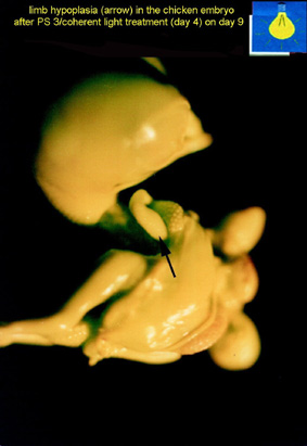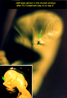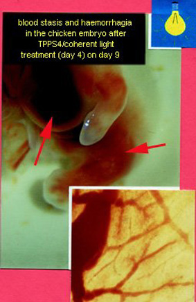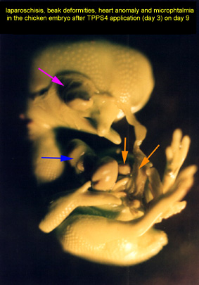 University, Prague, CZ Hematoporphyrine derivatives are considered with an efficient agents for photosensitive therapy. Systemically or topically administered, Photosan 3 (PS 3) and meso-tetra-para-sulfonatophenylporphine dodecahydrate tetra sodium salt (TPPS4) are being recognized as a photosensitive hematoporphyrine derivatives highly attacking the immature tissues (e.g. tumors, embryonic organ primordia and primitive vessels). All these porphyrine photosensitizers are able to support a production of the toxic singled oxygen destroying the photosensitizer-filled tissue after coherent light irradiation. Exogenously applied porphyrine derivatives significantly increase long-lasting photosensitivity of treated tissues (e.g. skin) as a side effect. Using chicken embryo model we are examining in this study relation between various porphyrine compounds and host tissues even before light exposure and relative affinity to organ primordia and vascularized tumor transplant after systemic administration. The critical questions are: Do they exert some embryotoxic influence on the growing tissues after exogenous administration ? Which anomalies, if any, can be observed after photosensitizer application ? Since the pharmacodynamic fate of PS 3 and TPPS4, in the organism after exogenous administration is not fully understood, the effect of all these compounds was studied in vivo in the chicken embryo. Method CHEST procedure The Chicken Embryotoxicity Screening Test was used to estimate the beginning of of the embryotoxicity dose range. TPPS4 or PS 3 dissolved in the distilled water were injected subgerminally or intraamniotically on days 3 to 5 (either 3ml or 10ml) to the chicken embryo (0,3 to 300 mg per embryo) in single doses 3, 10 ml). This is the time in which organ primordia are extremely sensitive for exogenous chemical treatment. On reaching day 9-10 the embryos were collected, weighted, and all embryos were examined using stereomicroscope (Wild M 420, Leitz, Swiss). Gross dose-response relationships were established by summing up the dead and living malformed embryos for each dose and day of administration. The beginning of the embryotoxicity range was determined as lying between the doses where the dose-response curve crossed the nonspecific effect level. The nonspecific level constitutes the maximal background frequency of malformed and dead control embryos that occurs spontaneously and/or is induced by experimental intervention itself. Results