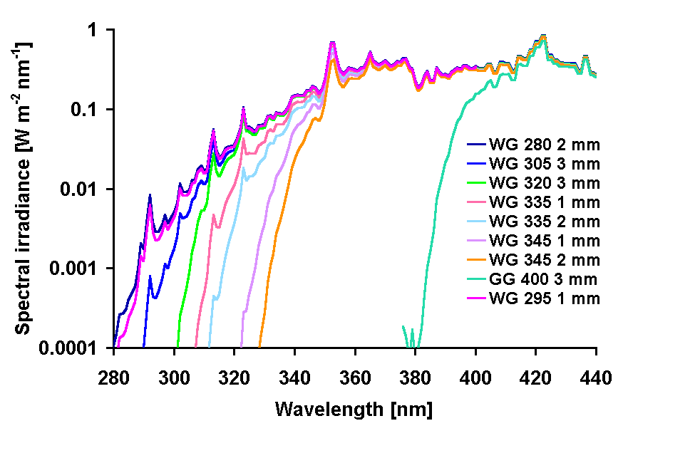 irradiance spectra in the ultraviolet were produced by inserting cut-off filters between