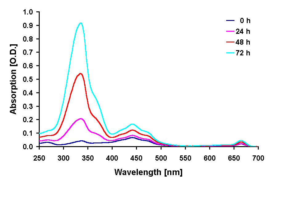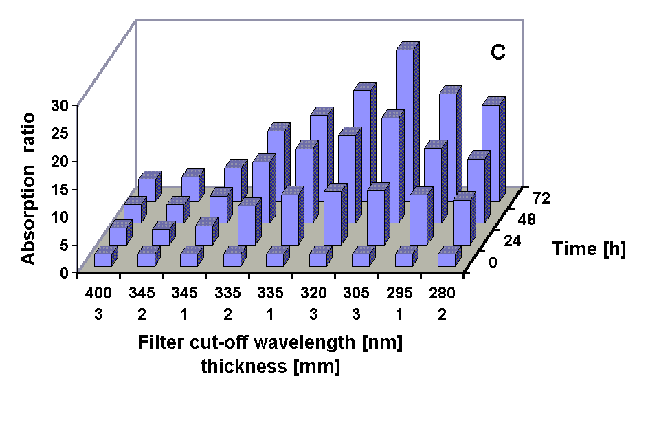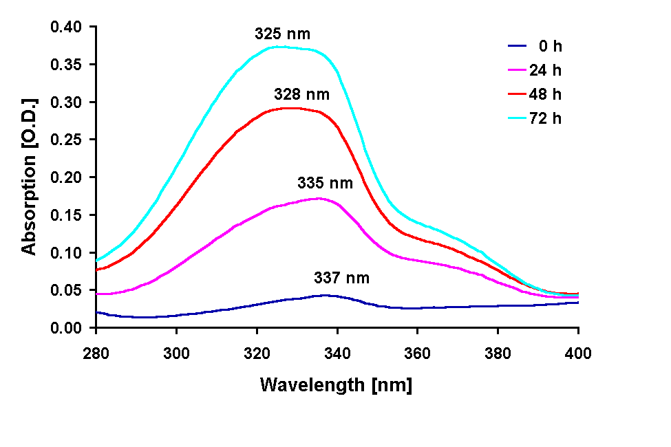 exposed to solar lamp under a WG 305 cut-off filter for up to 72 h. Fig. 3: Changes in the spectral shape of the absorption of methanolic extracts from