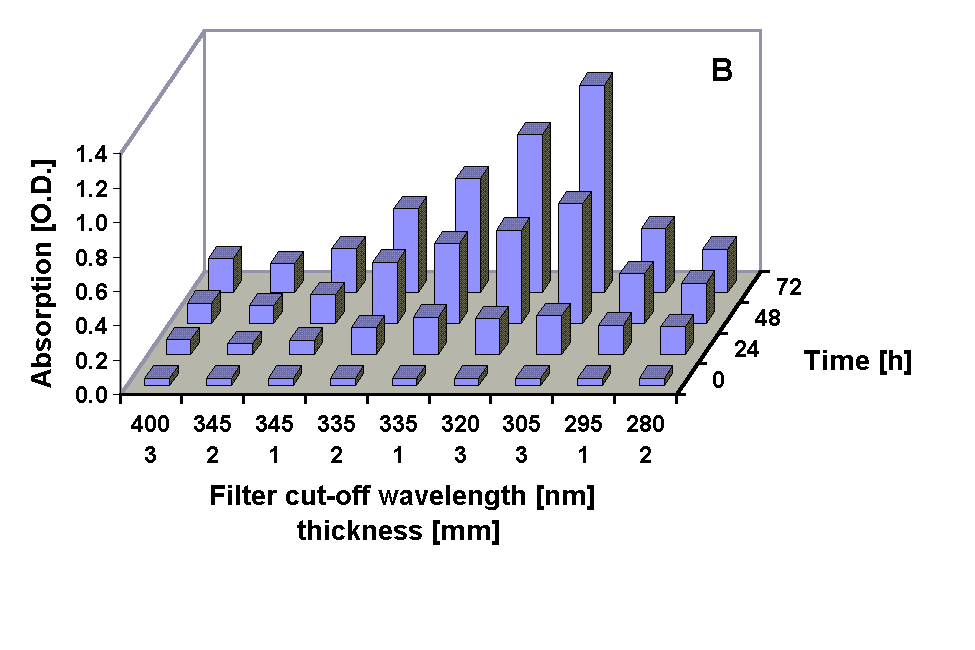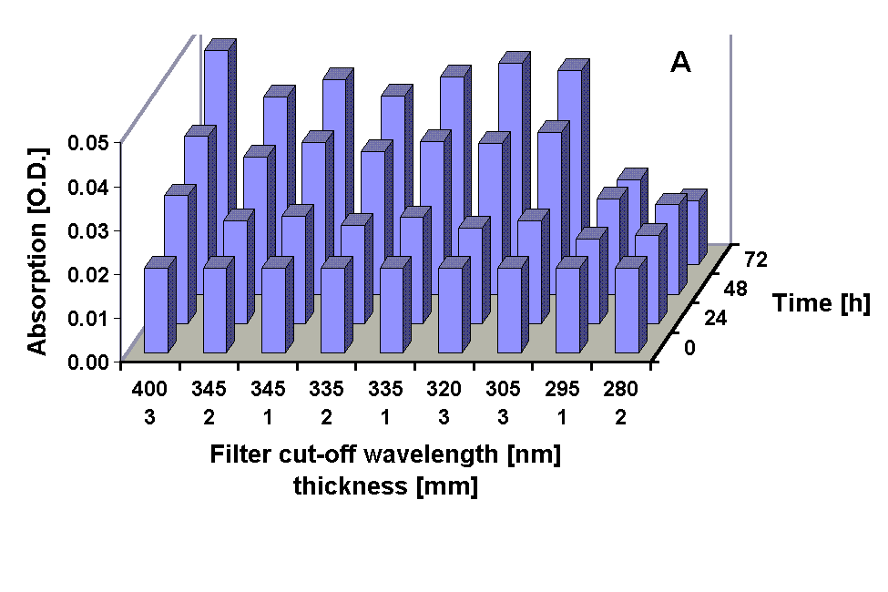 polychromatic radiation (PAR and UV) from a solar simulator for up to 72 h. Different