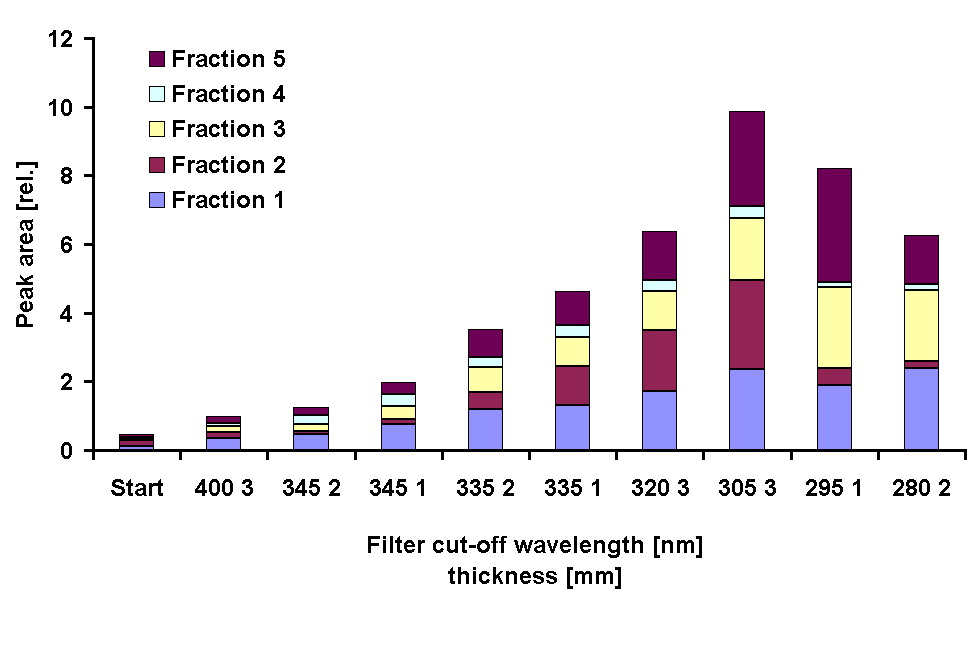 below 300 nm tailing into the longer wavelength range. Fig. 5: Chromatographic separation of MAAs from G. dorsum exposed to solar lamp under a WG 305 cut-off filter for 72 h. For a relative measure of the contribution of the different fractions to the total MAA amount, the integrated peak area at the maximum absorption wavelength of each peak (334 nm for fraction 1) was used. The total peak area of the treatments showed the same pattern as the extent of the UV absorption peak obtained in spectroscopic analysis: an increase down to a cut-off wavelength of 305 nm and lower values under the 295 nm and 280 nm cut-off filters (Fig. 6). The pattern of MAA composition among the different treatments was congruent in both experiments. The proportion of palythine increased when long wavelength UV-A was included in the irradiance spectrum (cut-off 345 nm) and decreased when shorter wavelengths were added (cut-off < 345 nm). Porphyra-334 contributed less to the total peak area when UV-A radiation was included but increased when shorter wavelengths were added down to a cut-off wavelength of 305 nm. Under the 295 nm and 280 nm filter the part of fraction 2 (porphyra-334) almost disappeared in comparison to all other cut-off filters. Fig. 6: Peak areas of the fractions obtained in HPLC chromatograms obtained from G. dorsum before and after exposure to a solar lamp under different cut-off filter for 72 h. The peak areas were normalized to the Chl a concentration of the samples. Discussion G. dorsum is an organism adapted to high light environments. The organism exhibits a positive phototaxis even at the highest fluence rates and is hardly prone to photobleaching by high intensity white light [12]. The accumulation of high amounts of MAAs in G. dorsum in response to high irradiance is a feature likely contributing to the adaptation of this organism to conditions of high irradiance as they occur near surface in their natural habitat. Although UV radiation, especially UV-B, in coastal waters is strongly attenuated in the water column [13] due to the phototactic behavior, the organism is likely to be exposed to significant doses of UV-A and UV-B radiation. As a consequence of their absorption properties most MAAs provide the strongest protection in the UV-A range. Cultures of the dinoflagellate Gymnodinium sanguineum containing high amounts of MAAs, in contrast to those with low MAA concentration, are almost insensitive to photoinhibition of photosynthesis by radiation in the wavelength range between 320 nm and 360 nm [14]. The increase in Chl a during the experiments in the present study was not or only slighly affected by the high level of UV-A that was applied. Only under the 295 nm and 280 nm cut-off filters which transmit considerable amounts of UV-B radiation, the Chl a level remained almost constant during the experiment (295 nm cut-off), respectively declined (280 nm cut-off) indicating severe inhibition of growth by short wavelength radiation. The irradiance spectra produced by the combinations of the solar lamp and the set of filters used in the experiments exhibit broad overlaping regions of differing spectral irradiance (Fig. 1) so that conclusions from the present data on spectral effects of radiation cannot be drawn with great precision. However the large difference in long wavelength UV-A radiation between the 400 nm cut-off filter and the 345 nm cut-off filters produced only a small increase in the ratio of UV peak absorption to Chl a absorption in methanolic extracts and in total peak area of chromatograms. In marine organisms so far only two aminocyclohexenone MAAs have been identified: mycosporine-glycine and mycosporine-taurine [15]. The shorter retention time of the fraction 3 in G. dorsum indicates that this substance might be the more polar mycosporine-taurine. However to prove this, chemical characterization would be necessary which is beyond the scope of this study. The change in MAA composition under the short wavelength cut-off filters (295 and 280 nm) leads to a relative increase in the absorption of UV-B radiation. However, considering the decrease of one specific MAA (porphyra-334) it seems likely that there is either a specific inhibition of the synthesis of or this compound or porphyra-334 is selectively metabolized under the short wavelength UV radiation. Another factor possibly causing changes in the MAA composition is the nitrogen nutritional status of the organisms. The UV absorption peak in methanolic extracts of G. dorsum from stationary growth phase or that have been transferred to nitrogen free medium is shifted to shorter wavelengths (unpublished data), indicating that there is a change in the MAA composition. It is known that UV-B radiation leads to reduced uptake of NO3- by planktonic algae [16], so that the observed effect might be an indirect effect, mediated by reduced availability of nitrogen for the biosynthetic pathway of MAA synthesis. Acknowledgements This work was financially supported by the European Union (DGXII, Environment