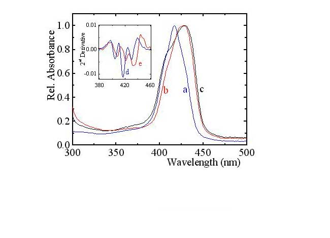 Figure 2. Normalized absorption spectra of the porphyrins in the Soret region: