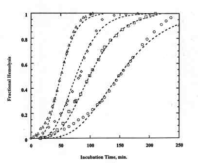 The results show that k » 2 for bound Lu-Tex and k » 3 when free Lu-Tex was in the system. The average value of S is constant 1.56± 0.05. (Runs with free Lu-Tex present had steeper DPH curves at t50 > 120 min.) The correlation of the rate data with Eq. (1) is shown in Figure 2. The presence of free Lu-Tex led to much faster DPH. Scaling to the relative Lu-Tex concentrations indicates that free Lu-Tex was approximately 6 times more active than bound Lu-Tex with bovine RBC and approximately 3 times more active with human RBC.3.3. Effect of temperature and additives: The rate of DPH was increased at higher incubation temperatures and higher irradiation temperatures. The Arrhenius plot in Figure 3 leads to activation energies of 6 kcal/mol for increasing incubation temperature and 11 kcal/mol for increasing irradiation temperature. The 1Dg quenchers 30 mM azide ion and 30 mM tryptophan (Trp) led to essentially complete protection of DPH photosensitized by bound Lu-Tex and bound plus free Lu-Tex.3.4. Data analysis with the multi-hit kinetics model: A recent kinetics model for photohemolysis is based on the following assumptions: (1) Photohemolysis takes place by thermal activation of photochemical damage. (2) Damage thresholds exist for the photochemical and thermal stages of DPH.4,5,8 The model parameters are the photochemical hit number m, the thermal hit number q, a coupling constant a between the photochemical and thermal stages, and a parameter b proportional to the incident fluence per unit sensitizer concentration and the quantum efficiency. The detailed development leads to the following results:(1) The model predicts Eq. (1) and Eq. (2) in the limit of low light dose with m » k » j for any value of q.(2) S depends only on q for any value of m. The function S(q) is calculated.6Based on Table 1, the present data are analyzed with m = 2 and q = 6 for bound Lu-Tex and m = 3 and q = 6 for bound plus free Lu-Tex. The value of a is taken as 10.0 min-1 from prior quantitative DPH measurements with PpIX.8 The fitting is very sensitive to q and insensitive to a. The lines in Figure 1 exemplify the good agreement of the model with the data. The average value of b is approximately constant for all runs at 3 x 10-10 min-1 .4.0. DISCUSSION Bound Lu-Tex parallels other photodynamic agents with k » 2. This result implies that two membrane targets are involved in DPH. The targets proposed for PpIX are the anion channel protein (band 3) and peroxidation of membrane lipids; see citations in Ref.-8. The higher k for systems in which the free Lu-Tex was present suggests that additional targets are available to 1Dg generated in the external medium. Structural membrane proteins are a possible target. Evidence for this damage was found for photosensitization of RBC ghosts by hypericin.10 Additional targets also explain the higher photoactivity of free Lu-Tex compared to bound Lu-Tex. Assuming that the 1Dg quantum yield (FD ) of bound Lu-Tex is comparable to 0.38 in 5% Tween 20 3 and that FD in PBS is comparable to 0.11 in water 1, the free Lu-Tex must be an order of magnitude more photosensitizing than bound Lu-Tex. The parameter m = 2 in the kinetics model specifies the kinetics order of the photochemical stage. Multiple occurrences of photochemical hits leading to hemolysis are specified by q = 6. Thermal activation of the incubation stage is consistent with the model. The 6 kcal/mol activation energy may involve membrane fluidity. The 11 kcal/mol activation energy of the irradiation stage may result from more efficient 1Dg generation at higher temperatures and/or faster 1Dg reactions with the membrane. The "colloid-osmotic" model postulates that photochemical damage to the RBC membrane leads to cation efflux and cell swelling followed by rupture.11-12 Based on the present results, we propose an extension of the "colloid-osmotic" model in which photochemical damage to the RBC membrane also generates initiation sites for hemolysis.5. SUMMARY AND CONCLUSIONS 1. A recent study on photosensitized inactivation of lysozyme by Lu-Tex led to the conclusion that 1 Dg is only active intermediate.3 The present work extends this primary mechanism to photosensitization of red cell photohemolysis by Lu-Tex.2. The DPH rate varies with the approximate 2nd power of the incident fluence for bound Lu-Tex and the approximate 3rd power of the incident fluence when the bound and free components are present. 3. The photodynamic activity of free Lu-Tex is an order of magnitude higher than that of bound Lu-Tex. 4. The DPH rate is faster at higher incubation temperatures and higher irradiation temperatures. 5. The multi-hit kinetics model predicts important features of the DPH curves, including the functional form of empirical Eq. (1) at low light dose and the constant relative steepness. 6. Photochemical damage to the RBC membrane generates initiation sites for cell rupture which act cooperatively during dark incubation. ACKNOWLEDGMENTS The authors are pleased to acknowledge helpful comments by Dr. Tarak D. Mody of Pharmacyclics, Inc. (Sunnyvale, CA) and thank him for providing the sample of lutetium texaphyrin. REFERENCES [1] J. L. Sessler, W. C. Dow, D. O'Connor, A. Harriman, G. Hemmi, T. D. Mody, R. A. Miller, F. Qing, S. Springs, K. Woodburn, and S. W. Young, Biomedical applications of lanthanide (III) texaphyrins. Lutetium (III) texaphyrins as potential photodynamic therapy photosensitizers, J. Alloys and Compounds, 249 (1997) 146-152 [2] M.. A.. Renschler, A. R. Yuen, T. J. Panella, T. J, Wieman, S. Dougherty, L. Esserman, M. Panjehpour, S. W. Taber. V. H. Finger, E. Lowe, J.. Engel, K. W. Woodburn, W.-F. Cheong, and R. A. Miller, Photodynamic therapy trials with lutetium texaphyrin (Lu-Tex) in patients with locally recurrent breast cancer, Proc. SPIE, 3247 g is only active intermediate.3 The present work extends this primary mechanism to photosensitization of red cell photohemolysis by Lu-Tex.2. The DPH rate varies w