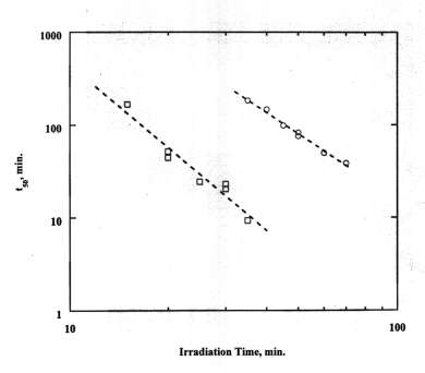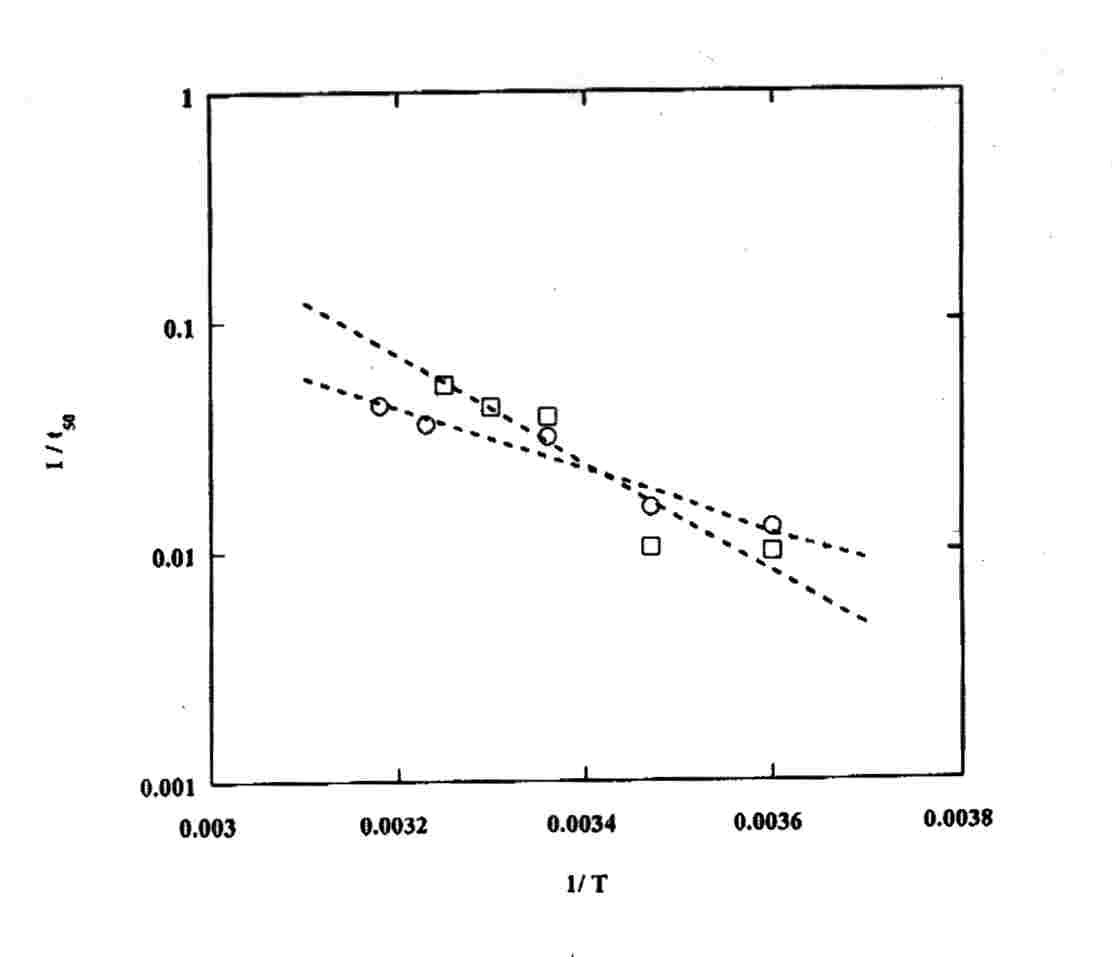 Figure 2. Correlation of DPH data with Eq. (1) for bovine RBC: O, 1.5 mM bound Lu-Tex; ; 1.5 mM bound Lu-Tex plus 4.5 mM free Lu-Tex. Figure 3. Arrhenius plots for temperature dependence of DPH: 1/t50 vs 1/T. , Human RBC with 1.2 mM bound Lu-Tex irradiated at 25° C and incubated at temperatures from 5°C to 42°C. , Bovine RBC with 1.5 mM bound Lu-Tex irradiated at temperatures from 5°C to 35°C and incubated at 37°C. |