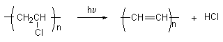 The principal pathway for the non-oxidative thermal or photochemical degradation of poly(vinyl chloride)(PVC) is a dehydrochlorination process which results in the introduction into the polymer of a distribution of unsaturated polyene sequences of various lengths. As the values of n reach about 5-6 , absorption of light by the sequences in the visible region (l ³ 400 nm), becomes significant even for small (~ 0.1%) extents of degradation and the polymer begins to appear coloured. In oxidative environments additional bond scission and crosslinking reactions occur which involve the intermediacy of peroxy and hydroperoxy macroradicals and lead to undesirable changes in the polymers physical and mechanical properties. In spite of intensive investigations and although considerable progress has been made, the mechanisms by which the processes are initiated are not completely understood and a number of possibilities have been proposed[5]. One of these, an ionic mechanism which involves the participation of polyenylic cations, owes its origin to the known catalytic effect of strong electrophilic reagents such as AlCl3 on the rate of thermal degradation[6]. A formal similarity exists between degraded PVC containing polyene sequences, which may act as sites for additive organic compounds make them the subject of intense current interest.