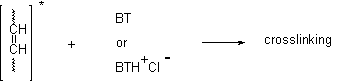 The second possibility suppose chemical reaction between BT and destroyed polymer chain. The bigger percentage of the quantity substance detained in polymer after irradiation for the compounds with more large molecule(compounds 2 and 3) is seriously proof that they participate active in the crosslinking of the polymer. BT can realize the chemical bond with the polymer chain and can play role of bridges between the chains(Scheme 7):
