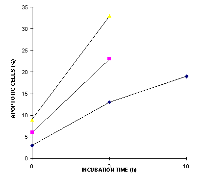 DISCUSSION The present study has shown that mouse lymphoma cells of the line L5178Y-R can undergo apoptosis and that the development of the reaction is relatively rapid (fig. 1). Early apoptosis in cells in vitro is also induced by other photosensitised reactions, e.g. by photoactivated protoporphyrin (24). However, the development of apoptosis is dependent on the sub-cellular localisation of the photosensitising drugs (25). Three different methods have been used to measure the fluorescence from the cells, and two different biological characteristics, namely the presence of free DNA-ends and morphological changes of the nuclei, give rise to the differences in fluorescence observed. In a previous paper (11) an indication of double strand breaks in the DNA of mouse 308 epitheloid cells was found, but no gross morphological changes were observed. The choice of LY-R cells in the continuation of our studies was based on the fact that they are sensitive to ultraviolet radiation and hydrogen peroxide, and it has been shown by the authors (11) and by Rosenstein et al (7) that this species and other peroxides may be important for the phototoxic effects of bilirubin. It was shown previously that the phototoxicity is prominent after light doses that cause photooxidation of bilirubin, which is supported by the data in figures 2 and 3. Furthermore, it was shown that a fraction of the phototoxic products leading to cellular damage was formed in the medium outside the cells, and that addition of catalase, but not superoxide dismutase, to the medium reduced the cytotoxicity (8,9). Therefore, it is reasonable to assume that the fact that the LY-R cells undergo apoptosis is a result of hydrogen peroxide production in the cells and in the medium. The toxicity of bilirubin in the dark is not fully elucidated, but several mechanisms are possible (26). It is probable that the dark toxicity and the phototoxicity of bilirubin act by different mechanisms and that some of the phototoxic reactions are a «type III» -photosensitising effect arising as a result of the toxicity of the photoproducts of bilirubin acting together with the production of H2O2 (7). In cells treated with photoactivated bilirubin, it is to be expected that the cellular damage is a mixture of responses to bilirubin and its photoproducts. The present paper indicate that apoptosis as well as necrosis are possible modes of cell death. Our data show that the presence of free bilirubin (not bound to albumin) increases the efficiency of the photosensitisation. In figure 2 and the tables I and II it can bee seen that the cells are killed by a lower light dose when suspended in 50 mM BSA instead of a solution of 200 mM HSA. Both solutions contained 160 mM bilirubin, however, the latter containing HSA had a higher molar concentration and most of the bilirubin was bound to the HSA. The split dose experiments show that there is a possibility that delivery of light at a high dose rate in fractions may give slightly more cellular damage than continuous light exposure, but these experiments are technically difficult to perform and the variance between individual experiments is large. Furthermore, the toxicity in the controls is relatively high. The temperature of the cell suspensions were measured during a typical experiment and was found to be below 37oC. In the future more detailed studies will be performed to see if the tendency observed is significant, and to attempt to explain a possible split dose effect or a dose rate effect. The dose rate during phototherapy may influence the formation of bilirubin isomers. Probably there exists an optimal dose rate where the therapeutic effect is maximum (3) and the detrimental effects of light exposure are of limited significance for the patient. ACKNOWLEDGEMENTS This study was supported by The Research Council of Norway. The high quality technical assistance of Mr. Fredrik Liland is highly appreciated. Figure 1: The induction of apoptosis assayed by the formation of fragmented nuclei in mouse lymphoma cells stained with propidium iodide at 0, 3 and 18 hours after blue light irradiation for 1.5 h of 5.5 mW/cm2 irradiance in a solution of bilirubin containing BSA. Results from three independent experiments are shown.