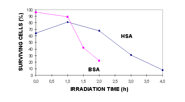 Figure 2: Induction of necrosis in mouse lymphoma cells irradiated with blue light (5.5 mW/cm2) for 0-4 h in solutions of bilirubin and BSA or HSA. Exclusion of trypan blue was assayed after 18 h incubation.