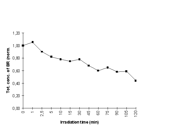 Figure 3: The sum of conc. of ZZ-BR and photoisomers E-lum, Z-lum and ZE/EZ-BR after irradation times of 0-120 min. Total conc. is normalised to 1.0 prior to irradiation.