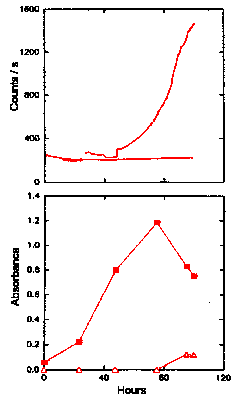 of the formation of hydroperoxides. Also shown in the lower graph is the UV absorbance at